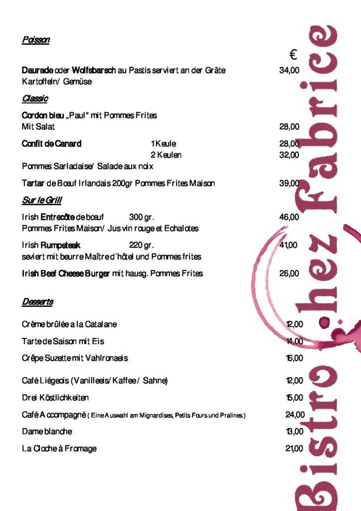 Unser Bistro Chez Fabrice bietet Ihnen täglich wechselnde Gerichte auf hohem Kochniveau!